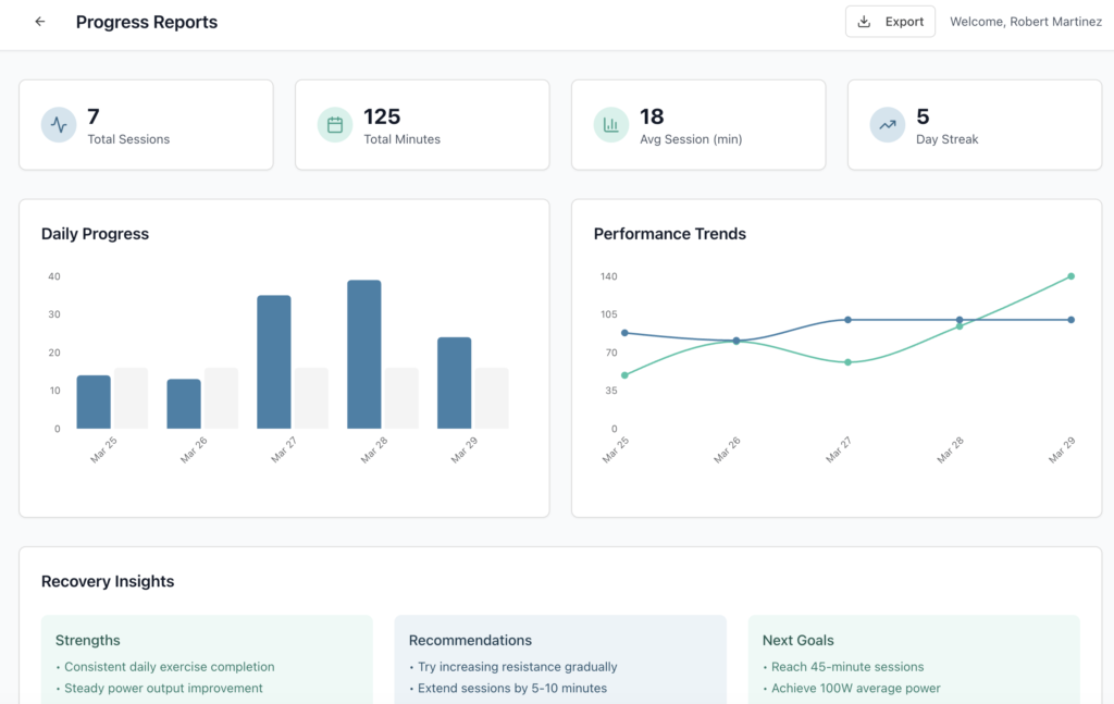 Every session captures resistance levels, repetitions, duration, and progression. No subjective assessments. No clipboards.